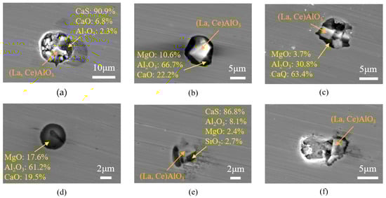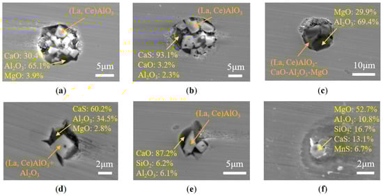 Typical morphologies and compositions of inclusions in the tundish pouring zone. (a) (La,Ce)AlO3+Al2O3-MgO-CaO; (b) (La,Ce)AlO3+Al2O3-CaO-CaS; (c) (La,Ce)AlO3-Al2O3-MgO-CaO+Al2O3-MgO; (d) (La,Ce)AlO3-Al2O3+Al2O3-MgO-CaS; (e) (La,Ce)AlO3+Al2O3-CaO-SiO2; (f) Al2O3-CaS-MgO-SiO2-MnS.