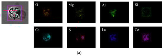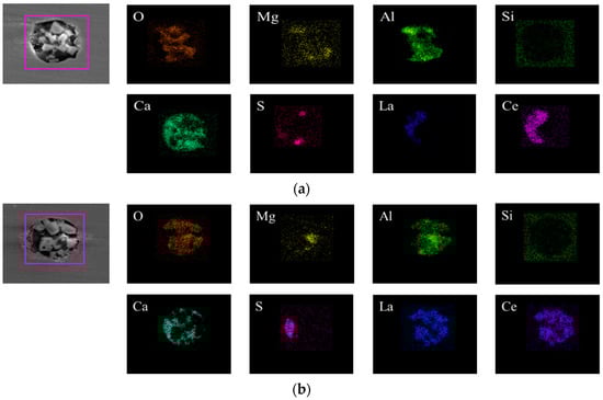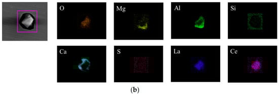 Surface scanning results for inclusions in the steel at the end of the RH refining process. (a) (La, Ce)Al2O3+CaS-MgO-Al2O3, (b) (La, Ce)Al2O3+CaS-MgO-Al2O3-CaO.