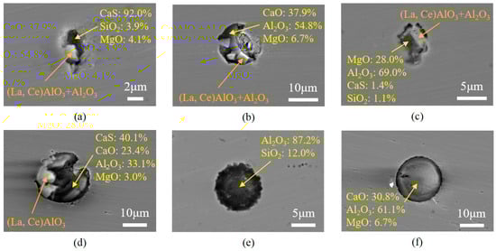 Typical morphologies and compositions of inclusions in the steel at the end of the RH refining process. (a) (La,Ce)AlO3+Al2O3+MgO-CaS-SiO2; (b) (La,Ce)AlO3+Al2O3+Al2O3-CaO-MgO; (c) (La,Ce)AlO3+Al2O3+Al2O3-MgO-CaS-SiO2; (d) (La,Ce)AlO3+Al2O3-CaO-MgO-CaS; (e) Al2O3-SiO2; (f) Al2O3-CaO-MgO.