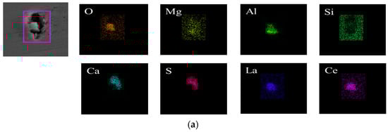 Surface scanning results for inclusions in the tundish pouring zone. (a) (La, Ce)Al2O3+MgO-Al2O3-CaO, (b) (La, Ce)Al2O3+CaS-Al2O3-CaO.