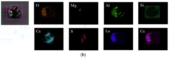 Surface scanning results for inclusions, with rare earth treatment. (a) (La, Ce)Al2O3+CaS-CaO-Al2O3, (b) (La, Ce)Al2O3+CaO-Al2O3-MgO.