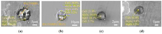 Typical morphologies and compositions of inclusions in the tundish impact zone. (a) (La,Ce)AlO3+Al2O3-MgO-CaO; (b) (La,Ce)AlO3-Al2O3+Al2O3-CaO-MgO-CaS; (c) Al2O3-MgO-CaS-CaO; (d) Al2O3-MgO-CaS.