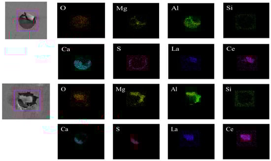 Figure 8 and Figure 9 show the typical morphologies, compositions and surface scanning results for inclusions in the tundish pouring zone. The types of inclusions in the tundish pouring zone are mainly (La, Ce)Al2O3+CaO-Al2O3-MgO, (La, Ce)Al2O3+CaS+oxides, and MgO-Al2O3-SiO2-CaS. The (La, Ce)Al2O3 inclusions are distributed in light, white blocks.