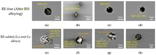 Morphologies and compositions of inclusions, before and after rare earth treatment, after RH alloying. (a) Al2O3-MgO; (b)MgO-Al2O3-MnO; (c) Al2O3-MgO; (d) Al2O3-MgO-MnS; (e) (La,Ce)AlO3+Al2O3-CaO-CaS; (f) (La,Ce)AlO3+Al2O3-MgO-CaO; (g) (La,Ce)AlO3+Al2O3-MgO-CaO; (h) Al2O3-MgO-CaO.