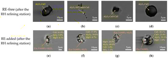 Morphologies and compositions of typical inclusions in the steel, before and after rare earth treatment, after the RH refining station. (a) Al2O3-CaO; (b) Al2O3-SiO2-MnS-CaS; (c) Al2O3-CaO-CaS; (d) Al2O3-CaO; (e) (La,Ce)AlO3+Al2O3-MgO-CaS-SiO2; (f) (La,Ce)AlO3-Al2O3+Al2O3-MgO-CaO; (g) (La,Ce)AlO3+Al2O3-MgO-CaS-SiO2; (h) (La,Ce)AlO3+Al2O3-MgO-CaS-CaO.