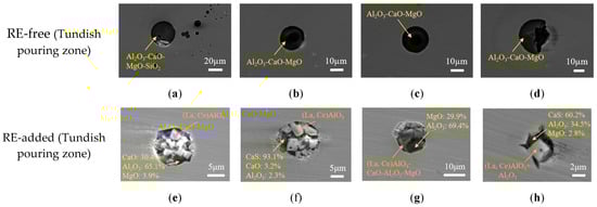 Figure 12 shows the typical morphologies and compositions of inclusions in the tundish pouring zone, before and after rare earth treatment. The results show that without rare earth treatment, the inclusions in the tundish pouring zone are composed of Al2O3-CaO-MgO-(SiO2), and their morphologies are spherical or oval. After adding rare earth, the main types of inclusions in the steel are (La, Ce)Al2O3+CaO-Al2O3-MgO, (La, Ce)Al2O3+CaS+oxides, and MgO-Al2O3-CaS.