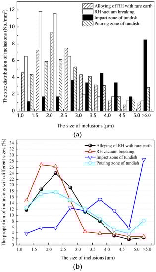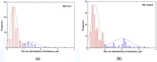 Size distribution of inclusions before and after rare earth treatment. (a) RE-free (b) RE-added.