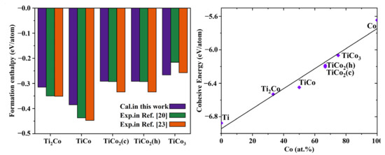 where is the formation enthalpy of , is the cohesive energy of , is the total energy of , and and are the cohesive energies of Ti and Co crystals, respectively, and and is the energy of a single atom. The formation enthalpy and cohesive energy of all Ti-Co compounds are negative, indicating that these compounds are inherently thermodynamically stable. The formation enthalpy and cohesive energy as functions of the Co content are shown in Figure 2. The enthalpy of formation decreases initially, and then increased with the Co content, agreeing well with previous experimental results [20,23], while the cohesive energy increases with Co content, indicating a decreasing bonding strength between Ti and Co. Moreover, the lowest enthalpy of formation was −0.385 for TiCo, signifying that TiCo is the most stable one in thermodynamics, followed by Ti2Co.