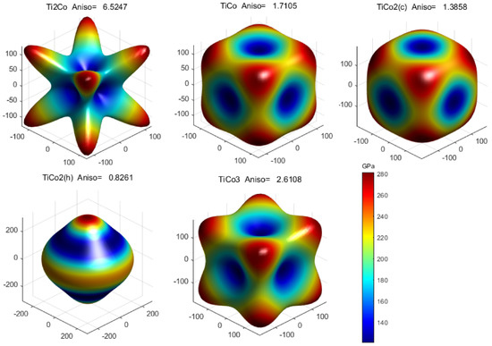 where , and are the direction cosines, and is the elastic compliance constants. In spherical coordinates, = , = and = , and the three-dimensional surface of Young’s modulus of Ti-Co binary compounds can be drawn (Figure 3). The Young’s modulus of five Ti-Co binary compounds is anisotropic. Ti2Co had the most anisotropic Young’s modulus, while the contour of TiCo2(h) Young’s modulus was spherical, showing a smallest anisotropic Young’s modulus. The anisotropy of Young’s modulus of the other three compounds was between those of TiCo2(h) and Ti2Co. Considering the crystal structure of TiCo2(h) (hexagonal lattice), the isotropic Young’s modulus of TiCo2(h) is easy to understand. However, Ti2Co is a complex face-centered cubic phase, so it showed a more anisotropic profile of Young’s modulus.