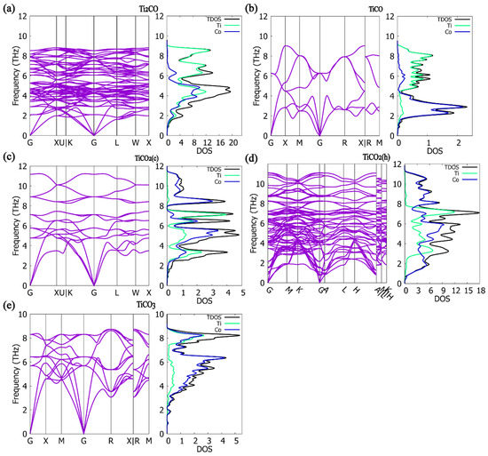 Phonon dispersion can accurately reveal the phonon behavior of crystal structure [56]. The phonon spectra and the density of states of five structures of Ti-Co binary compounds were calculated by the supercell method. The force constants were calculated in the finite displacement method [30] using the PHONOPY code [57]. The phonon spectra of Ti-Co binary compounds along the highly symmetric path and the corresponding projected phonon density of states are shown in Figure 4. All five compounds show no imaginary frequencies throughout the Brillouin zone and can, therefore, be shown to be thermodynamically stable. These five compounds basically vibrate in the frequency range of 0~12THz. It is obvious that the frequency range of TiCo2(c) and TiCo2(h) is wider than that of other compounds. The highest frequency of TiCo2(c) and TiCo2(h) can reach up to 12 THz. For both alloys, the Co atom vibrates in the full frequency range and the Ti atom vibrates in the range of 0–8 THz. The C atom has an important contribution in all phonon modes, whereas the O atom mainly plays a role in the low frequency region and the intermediate frequency region. For TiCo3, the Co atom also vibrates in the full frequency range, but the Ti atom mainly vibrates the high frequency region. For Ti2Co and TiCo, the Ti atom mainly vibrates in the high-frequency region and Co atom mainly vibrates in the low-frequency region. In general, the vibration frequency of Ti atom is higher than that of Co atom, mainly because the atomic mass of Ti atom is greater than that of Co atom.