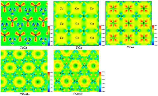 In addition, the differential charge density distribution is defined as the electron difference between an isolated atom and its bonding state, which gives information about the bonding properties [61]. The atomic (001) plane was chosen to illustrate the electron transfer properties of Ti-Co binary compounds in Figure 6. The shape characteristics of the differential charge density distributions around Ti and Co atoms show that the charge is mainly transferred from Co atoms to Ti atoms. Therefore, the binding mode of Ti-Co compounds is mainly determined by the Ti-Co bond. Some electrons are clearly out of domain in the interstitial region between Ti and Co atoms, implying the presence of metal and covalent-like bonds. For TiCo and TiCo3, there is a cross-shaped, red region around the Ti atoms, which means that the Ti atoms forms bonds with the Co atoms within this region. For Ti2Co, TiCo2(h) and TiCo2(c), a triangular red region forms around the Ti atom, indicating that Ti and Co atoms are mainly covalently bonded to each other. The more electron interactions there are between atoms in a compound composed of transition metals, the more stable the crystal structure is. The accumulation of a large number of electrons between adjacent atoms in TiCo, with large electron interactions, makes TiCo the most stable phase. This result is consistent with the enthalpy results. In addition, the charge transfer in Ti2Co indicates the highest binding force, which is consistent with the cohesion energy.