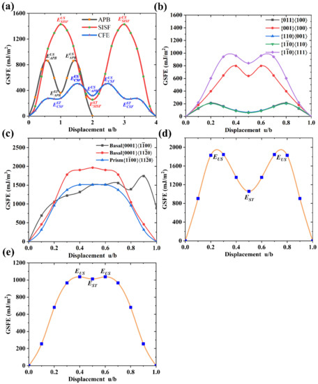 GSFE is defined as the fault energy related to the rigid displacement of one half of an ideal crystal relative to the other half along the Bernstein vector on the slip plane [68]. Under periodic boundary conditions, a fault plane can be generated by the rigid movement of part of a supercell. GSFE was calculated according to different slip systems along a specific slip direction, as shown in the Figure 7. The GSFE () value was calculated by [69]: