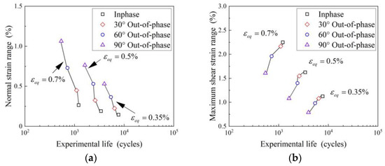Shear strain and normal strain are two important parameters affecting fatigue life. Taking AISI 304 stainless steel [27] as an example, the correlation between shear strain range and axial strain range on the plane and fatigue life are shown in Figure 3. The is equal to 1.5 in all loading paths. is the VM equivalent strain, which can be written as: