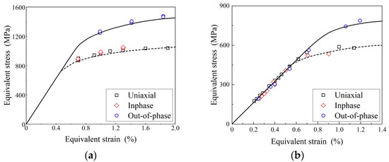 The cyclic stress–strain curve can describe the additional hardening degree of materials. The equivalent cyclic stress–strain relationship of BT9 titanium alloy and 7075-T651 aluminum alloy is shown in Figure 4. Figure 4a shows that the additional hardening effect of BT9 titanium alloy under non-proportional loading is obvious, and the additional hardening degree decreases with the decrease in equivalent strain. Figure 4b shows that the stress level is close to the same equivalent strain, and there is no additional hardening in the elastic deformation region. In the high-strain region, the stress level increases and additional hardening occurs in this region. Additional hardening effects of different materials are different. The effect of material on additional hardening should be considered in the multiaxial fatigue life prediction.