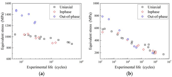 Comparison of the experimental life with predicted life: (a) 16MnR steel; (b) GH4169 alloy.