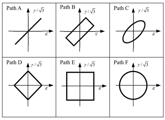 In order to verify the validity and accuracy of the model proposed in this study, five metal materials were selected to evaluate and validate the model. The mechanical and fatigue performance parameters of the five materials are shown in Table 1. The various loading paths used in this paper are shown in Figure 7. In additional, the classical FS model and SWT model are used for comparison and validation. The fatigue test results for the five materials are shown in Appendix A, Table A1, Table A2, Table A3, Table A4 and Table A5.