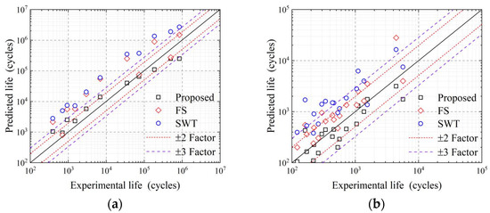 Comparison of the experimental life with predicted life: (a) Pure Ti, (b) Q235 steel.