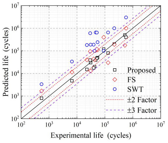 The prediction results of the proposed models and the comparisons are shown in Figure 8b, and it can be observed from the figure that the errors in the predicted results of the new model are within the range of three factors. The proposed model gives a more conservative prediction result, while the FS model and SWT model give an un-conservative prediction result.