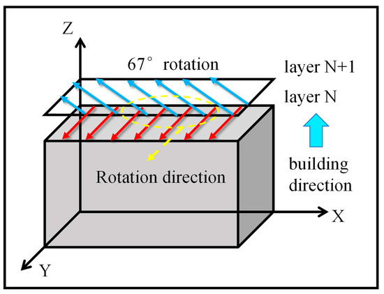 PBF printing with HEA powder was performed using an EP-M250 printer equipped with a continuous ytterbium fiber laser (wavelength: 1060–1090 nm) and an F-θ lens system. Before printing, the powder was vacuum-dried and kept at 90 °C for 2 h to remove moisture to ensure adequate dryness of the powder. We selected 316L stainless steel with a similar chemical composition to CoCrFeNiMn HEA as the formation substrate. In the printing process, the laser scanning strategy adopts a layer rotation of 67° (as shown in Figure 1) so that it can effectively reduce the stress concentrated inside the sample and minimize faults and macroscopic cracks. To avoid the problem of powder oxidation during the formation process, high-purity argon (99.999%) was selected as the protective gas, and the oxygen content was controlled below 100 ppm. By optimizing a series of processes and parameters, bulk energy density was calculated at 100 J/mm3. Under this condition, CoCrFeNiMn HEA with comprehensive mechanical properties such as 13.8% elongation, 587.5 MPa yield strength, and 666.3 MPa tensile strength were printed. Compared with the as-cast and welded CoCrFeNiMn HEA, the tensile strength of the PBF-printed samples showed significant improvement.