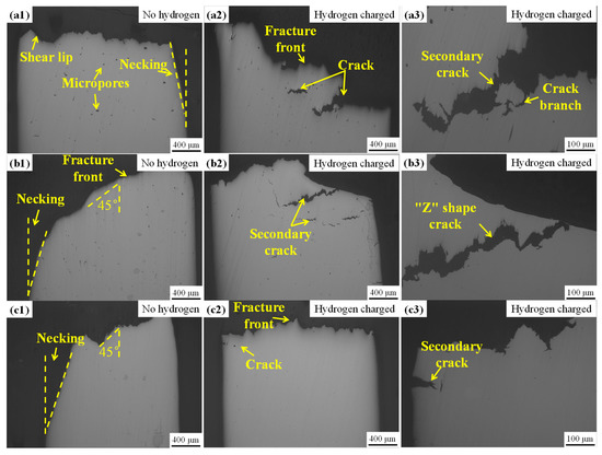 The surface morphology of the tensile-fracture side of the sample annealed at 900 °C is shown in Figure 2(b1–b3). The edge of the sample without hydrogen-charging shows an obvious necking phenomenon, which is more obvious than that of the PBF-printed sample, indicating an improvement in plasticity. In addition, the fracture front presents a 45° shear fracture, indicating a plastic fracture. In a state of dynamic electrochemical hydrogen-charging, many secondary cracks appear on the surface of the fracture side, which shows a “Z” shape expansion; simultaneously, small crack branches are generated. There is no obvious shrinkage at the edge of the side surface under the condition of hydrogen-charging, indicating that the fracture mode of the annealed sample under the condition of hydrogen-charging is one of brittle fracture.