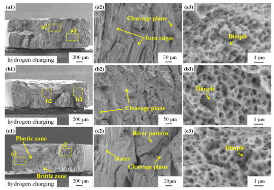 Tensile-fracture morphology of CoCrFeNiMn HEA samples in three different states in a hydrogen-filled solution: (a1–a3) S1 state; (b1–b3) S2 state; (c1–c3) S3 state.
