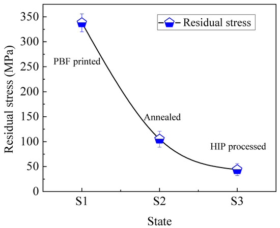 The above cracks relate to the measured residual stresses shown in Figure 4, in which the residual stresses were 338 ± 4 MPa, 105 ± 4 MPa, and 44 ± 4 MPa for the samples in the S1, S2, and S3 states, respectively. The residual stress for all samples was tensile stress, resulting in the observable surface crack in Figure 2. It can be calculated that residual stress decreased 68.9% and 86.9% from the S1 to the S2 and S3 states, respectively. The cracks produced by residual stress were mainly crystal cracks, which resulted from hot cracks because the liquid film formed by a low eutectic melting point (residual liquid) weakened the bond between the grains and generated a crack under the function of residual stress [40]. Consequently, the greater the tensile stress was, the greater the generated crack widths became.