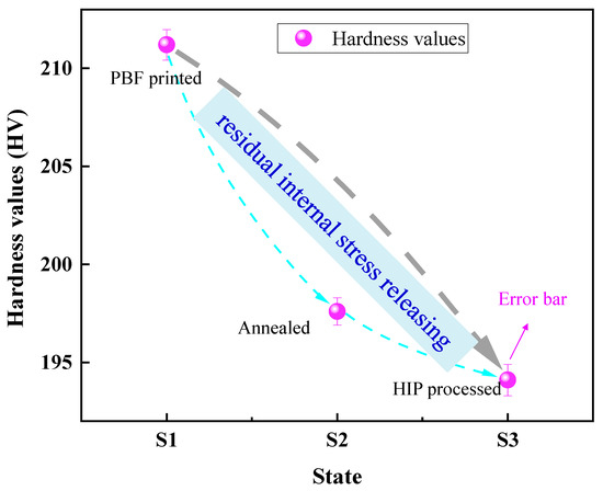 In this experiment, annealing and HIP were applied to further improve the properties of the printed samples. (1) Annealing process: the printed samples were sintered at 900 °C in an SG-XL1200 high-temperature box furnace for 1 h and then immediately cooled to room temperature. (2) HIP process: the printed samples were placed in an HIP QIH-9 from Quintus Technologies AB (Avure Technologies, Inc., Västerås, Sweden), which was equipped with a molybdenum heating system, heated to 1150 °C within 2 h, and then preserved for 3 h at the high pressure of 150 MPa under a high-purity argon protection atmosphere. The state of the sample after PBF printing is defined as S1. The state after PBF + annealing is defined as S2. The state after PBF + HIP is defined as S3.