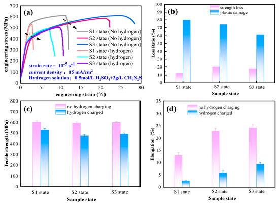 The sensitivity of HE was evaluated using plastic loss rate (δHE) and strength loss rate (UTSHE). The higher the loss rate, the higher the sensitivity of HE [41]. The calculation formula of loss rate is as follows: