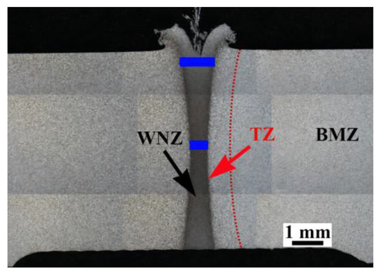 Figure 2 shows the typical cross-sectional morphology of the inertia friction welded FGH96 powder metallurgy joint. When optimized inertia friction welding parameters are selected, the as-welded joint shows typical bifurcation and flash characteristics [35,36]. The minimum and maximum widths of the weld nugget zone (WNZ) are 0.63 mm and 1.22 mm, as shown by the short, thick blue lines in Figure 2, respectively. Since the base materials on both sides of the welding pieces are the same, the whole weld zone and weld flash created by the discharge of contacting metals under axial pressure are symmetrical as a result of friction. In addition, it can be seen from the figure that there are no obvious welding defects, such as inclusions or cracks, in the as-welded joint. The research results of Masoumi et al. [36] show that optimized inertia friction welding process parameters are conducive to the full extrusion of the faying surfaces to be welded, and then the oxides in the weld joint can be removed.