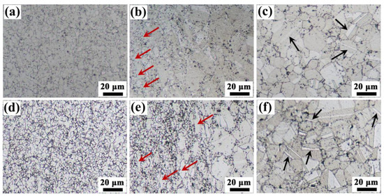 Due to the large temperature gradient experienced by the entire welded joint during the inertia friction welding process, the microstructure of the inertia friction welded joint shows three typical zones: the weld nugget zone (WNZ), the transition zone (TZ), and the base metal zone (BMZ), as shown in Figure 2. The microstructures at different zones of the inertia friction welded joint are shown in Figure 3a–c. The microstructure in the WNZ (Figure 3a) embodies the characteristics of extremely fine equiaxed grains resulting from complete recrystallization [37]. There is a large shear deformation and some axial shortening deformation in the WNZ. This large plastic deformation results in many sub-grain boundaries as crystal nuclei for recrystallization in the WNZ. Under the action of high temperature during the process of welding and rapid cooling after welding, the grains are formed by recrystallization but haven’t grown yet [37]. Therefore, many fine equiaxed grains are formed and the average grain size in the WNZ in this study is 4.18 ± 0.20 μm, which is far smaller than that of the base metal. The TZ (Figure 3b) contains the heat-force-affected zone and the heat-affected zone. In the heat-force-affected zone near the WNZ, the microstructure shows complex features. It is composed of fine equiaxed fine grains and deformed grains stretching along the extrusion direction (see the red arrow in Figure 3b). In this zone, only partial recrystallization occurs during the welding process due to the decrease in temperature and the weakening of plastic deformation. In the heat-affected zone adjacent to the BMZ, the grain size is slightly larger than that of the base metal, which indicates that the grains grow under the action of high temperature. Large equiaxed grains with a large number of twin structures inside the grain (see the black arrow in Figure 3c) can be found in the BMZ, shown in Figure 3c. The grain size in this zone is relatively uniform.