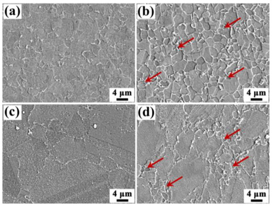 The microstructures at different zones of the inertia friction welded joint after semi-aging heat treatment are shown in Figure 3d–f. It can be clearly seen that the microstructure of the entire inertia friction welded joint still presents three typical zones. However, compared to the as-welded sample, the grain boundaries in the WNZ (Figure 3d) and the TZ (Figure 3e) are very clear, and a large number of very fine grains of <2.00 μm are observed in the semi-aging heat-treated sample shown by the red arrows in Figure 5b,d. It is the formation of the finer grains that causes the decrease in the average grain size. The average grain size in the WNZ was 2.88 ± 0.13 μm, assessed using the grain intercept count method. The formation of finer grain indicates that the semi-aging heat treatment after welding further facilitates recrystallization. However, the semi-aging heat treatment after welding has no impact on the microstructure of the base metal (Figure 3f).