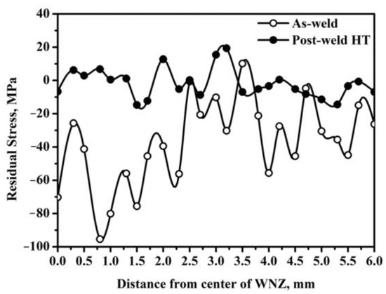 Figure 6 shows the axial residual stress distribution of different locations at the center of inertia friction welded joints of FGH96 powder metallurgy superalloy before and after heat treatment. Under the as-welded condition, the stress distribution of the entire inertia friction welded joint shows large fluctuations. The residual stress values in the WNZ and the TZ are much larger than that in the BMZ. In particular, the residual stress value near the TZ reaches a maximum, i.e., approximately −96 MPa. The negative value of residual stress represents the compressive stress, which exists along the axial direction at the center of the inertia friction welded joint [30]. The residual stress is associated with the welded microstructures in the inertia friction welded joint. In the WNZ, the grains are very fine and the residual stress generated by the large plastic deformation can be released due to the obvious recrystallization at high temperatures. However, in the TZ, only partial recrystallization occurs due to the relatively low temperature, which leads to the release of a portion of the residual stress. Thus, it has the largest residual stress value in the TZ.