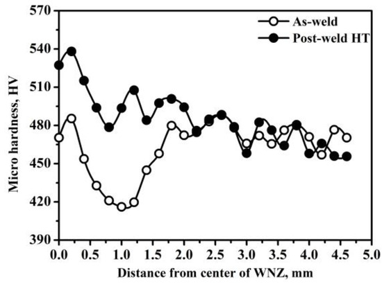 - Post-weld semi-aging heat treatment increased the micro-hardness of the WNZ from 470 HV to 530 HV. Meanwhile, post-weld semi-aging heat treatment also increased the room temperature tensile strength, which leads to the failure location relocating to the base metal.