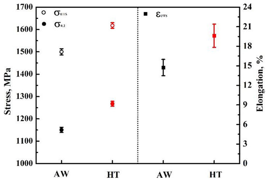 The room temperature tensile properties of the as-welded and semi-aging heat-treated samples are summarized in Figure 9. The as-welded sample presented an ultimate tensile strength (σuts) of 1500 MPa, a yield strength (σ0.2) of 1151 MPa, and an elongation at break (εab) of 14.74%. Since the failure occurred in the weld zone (shown in Figure 8), the tensile properties of the as-welded sample are determined by the microstructure and residual stress state of the inertia friction welded joint. Both the strength and the elongation of the semi-aging heat-treated sample were improved. The σuts, σ0.2, and εab reached 1618 MPa, 1268 MPa, and 19.6%, which were 7.8%, 10.2%, and 33.1% higher than that of the as-welded sample, respectively. The results for the room temperature tensile properties are consistent with that of the micro-hardness shown in Figure 7.