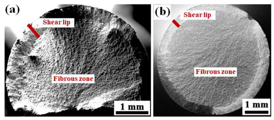 Figure 10 shows the tensile fracture morphology of the as-welded and semi-aging heat-treated samples at room temperature. For the as-welded sample, a shear fracture mode can be observed (Figure 9a and Figure 10a), whereas, a normal fracture mode can be found for the semi-aging heat-treated sample (Figure 9b and Figure 10b). However, no matter whether as-welded or semi-aging heat-treated, only two macro characteristic zones can be distinguished on the tensile fracture surface, i.e., the shear lip zone (shown by the thick red lines in Figure 10a,b) and the fibrous zone. A radical zone cannot be observed.