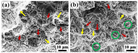 Figure 11 shows the fractography of room-temperature tensile-tested samples. Some shallow dimples with different sizes (shown by the red arrows in Figure 11a,b) and tearing ridges (shown by the yellow arrows in Figure 11a,b) can be observed in the fibrous zone for both as-welded sample and semi-aging heat-treated sample). The features of fracture morphology indicate that the inertia friction welded joint mainly presents a ductile mode of fracture in all samples. Noticeably, fractured particles (shown by the green circles in Figure 11b) were also observed in the fracture surface of the semi-aging heat-treated sample. Whereas, no such broken particles were found in the as-welded sample. This indicates that the fracture origins of the pre- and post-heat-treated samples are different. For the as-welded sample, the plastic deformation mainly occurs in the WNZ due to the low strength of the WNZ, resulting in dislocation pileup and cracks. For the semi-aging heat-treated sample, the plastic deformation occurs in the BMZ because of the higher strength in the WNZ, and the fracture of some inclusions induces cracks.