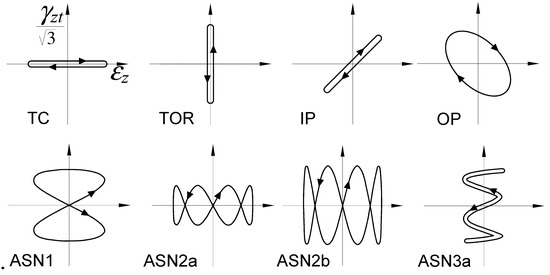 being , and the amplitudes and the frequencies of the normal and shear strains, respectively, and the phase shift angle. Note that if , a proportional (in-phase) loading takes place when , while a non-proportional out-phase loading is obtained for . On the other hand, if for both and , the type of loading is defined as asynchronous, with the normal and shear strain components not in constant proportion.