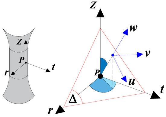 Let us consider a local frame (with origin at the abovementioned point P) attached to the critical plane (Figure 3). The displacement of the point P can be decomposed in a component , function of the strain tensor component along the normal to , and a component , function of the strain tensor components and both lying on .