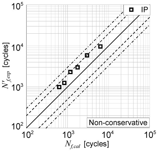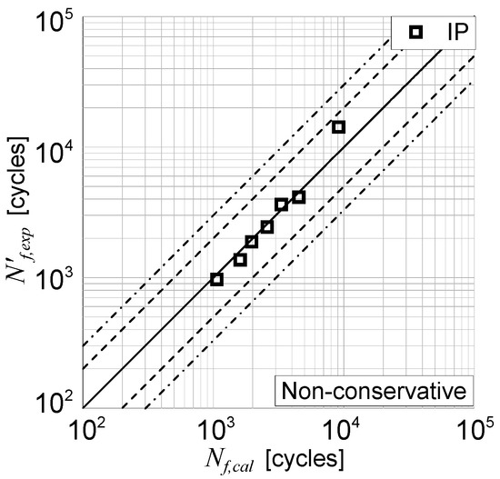 When loading components are in a constant proportion, such as in the case of the synchronous strain path IP where tension and torsion are in-phase, the damage parameter , defined in Equation (5), is used [26]. Figure 4 shows the correlation between the experimental fatigue life, , and the computed fatigue life, .
