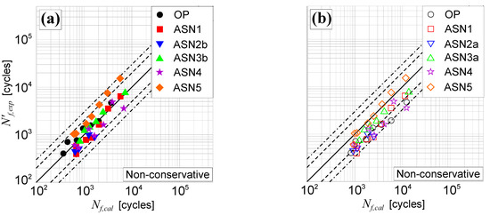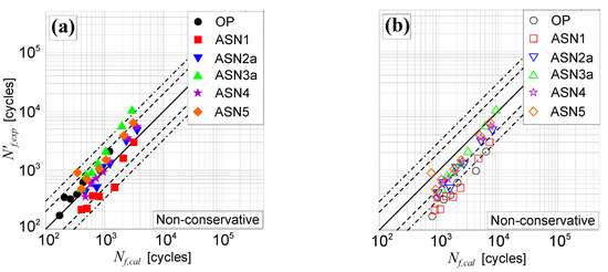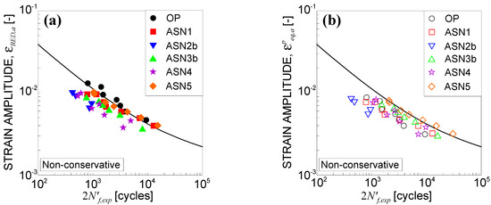 It can be noticed that, in Figure 9a, about one third of the results are conservative, although also the non-conservative ones (with the exception of the values related to loading paths ASN2b and ASN4) are very close to the Manson-Coffin curve. On the contrary, almost all the results determined by applying the procedure proposed in Ref. [26] are non-conservative as shown in Figure 9b.