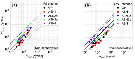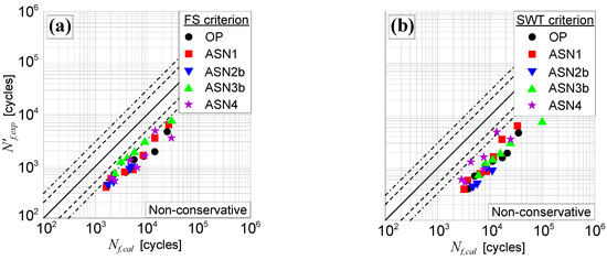 It can be noticed that, in Figure 5a, one third of the results are conservative, although also the majority of the non-conservative ones are very close to the Manson-Coffin curve. On the contrary, almost all the results determined by applying the criterion of Ref. [26] are non-conservative as shown in Figure 5b.