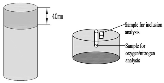 (I) Remelting start. First, the slag was mixed and placed in a graphite crucible. Then, the graphite crucible was placed in a high-temperature furnace with 1600 °C for melting. The slag weighted 1.2 kg. Argon with a flow rate of 1.5 Nm3/h was introduced into the mold through the protective cover. The pressure of the cooling water was between 0.2 MPa and 0.3 MPa. After the slag was completely melted, it was quickly removed and poured into the mold. The consumable electrode dropped and remelting began. (II) Stable remelting. When the remelting process stabilized, the current gradually increased to the set value until the end of remelting. (III) End of remelting. When the electroslag ingot reached the predetermined height, the power and argon supply were turned off. The electroslag ingot was removed after the slag was completely solidified. (IV) Sample test. As shown in Figure 2, the samples of 15 mm × 15 mm × 15 mm and Φ 5 mm × 100 mm were cut off at 40 mm below the upper part of electroslag ingot for inclusion and oxygen/nitrogen content analysis. An ASPEX scanning electron microscope system made in FEI company, Pittsburgh, PA, USA with a step size of 1 μm was used to test the size, morphology and composition of inclusions in the area of 50 mm2, and ONH-2000 was used to analyze the oxygen and nitrogen contents. The Ca content was analyzed by inductively coupled plasma atomic emission spectrometry (ICP-AES) and those of other elements were analyzed by electric spark direct reading spectrometry.