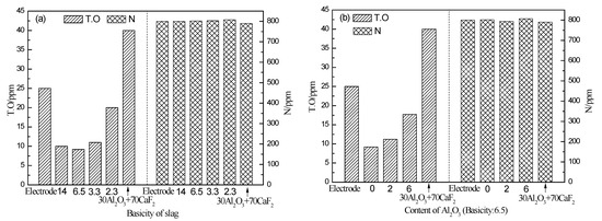 Effect of slag composition on oxygen and nitrogen content of electroslag ingot. (a) Effect of basicity on oxygen and nitrogen content. (b) Effect of Al2O3 content in the slag on oxygen and nitrogen content.