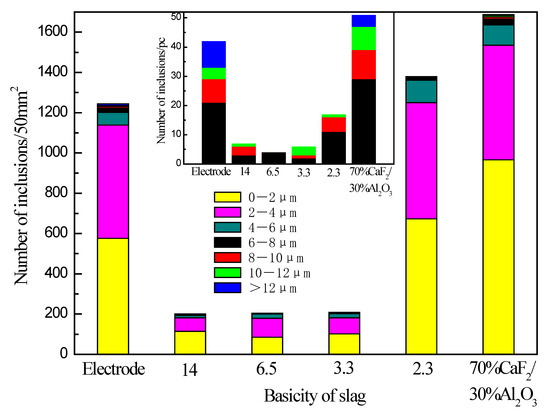 Not only the total amount of inclusions but also the number of inclusions with different diameters changed significantly. No matter the consumable electrode or electroslag ingot, inclusions less than 6 μm in diameter predominated. However, the number of large inclusions in the electroslag ingots changed evidently with the basicity.