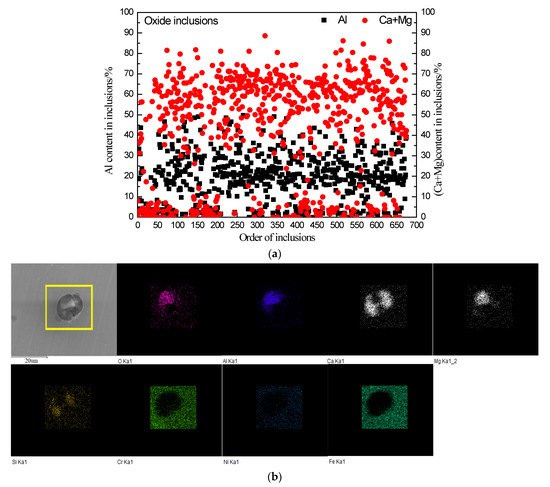 To compare the changes in inclusions in the ingots prepared with different slags, the composition and morphology of inclusions in the consumable electrode were analyzed first. Oxides (676 inclusions), sulfide–oxides (506 inclusions) and a small amount of MnS/CaS (62 inclusions) were found in the consumable electrode. Figure 5 shows the composition and morphology of oxide inclusions in the consumable electrode. In Figure 5b, the energy spectrum analysis is performed to decide the composition distribution of inclusions for the area in the yellow frame.