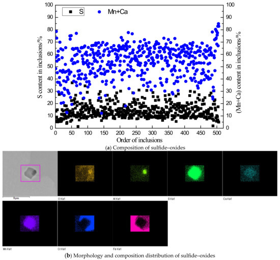 As can be seen from Figure 5a, the oxides in the consumable electrode were mainly composed of composite inclusions containing Al, Ca and Mg, and the contents of Ca and Mg in the oxides were evidently higher than that of Al. Such a finding was mainly due to deoxidization of the consumable electrode by Al during AOD and LF refining. Then, a SiCa wire was fed into the molten steel to modify the Al2O3 inclusions before continuous casting. The inclusions after Ca treatment were liquid in molten steel due to their low melting point. Therefore, they mainly existed in the steel as spherical inclusions, as shown in Figure 5b. Figure 6 shows the composition and morphology of sulfide–oxides in the consumable electrode.