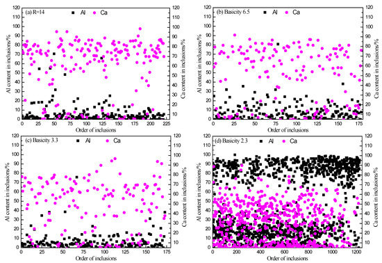With the decrease in basicity, the content of free SiO2 in the slag pool increased. Given the poor stability of SiO2 at high temperatures, it decomposed more [O] in the metal bath. Given the stronger binding force of Ca, Al and O, the [Ca], [Al] and [O] in the metal bath formed calcium aluminate inclusions in the solidification process, as shown in Figure 14b.