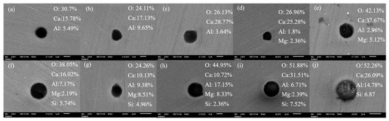 Morphology of inclusions in electroslag ingots prepared with Al2O3-free slag. (a–c): Ca-Al-O inclusions; (d,e): Ca-Al-Mg-O inclusions; (f–i): Ca-Al-Mg-Si-O inclusions; (j): Ca-Al-Si-O inclusion.