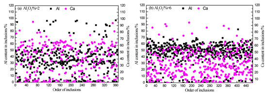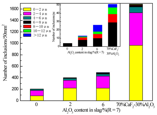 When Al2O3-free slag was used, not only the number of inclusions but also the diameter were the smallest. Four inclusions with a diameter greater than 6 μm were observed, and the maximum diameter was 7 μm. When 2% Al2O3 was added to the slag, 13 inclusions with a diameter greater than 6 µm were noticed, and the maximum diameter increased to 14 μm. When the Al2O3 content in the slag increased to 6%, the number of inclusions with a diameter greater than 6 μm increased to 26, and the maximum diameter was 17 μm. When the slag with 30 wt% Al2O3-70 wt% CaF2 was adopted, the number of inclusions with a diameter greater than 6 μm increased further to 51. However, the maximum diameter of inclusions barely changed.