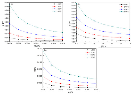 According to Formulas (1)–(3), the equilibrium relations of [Ca]-[O], [Si]-[O] and [Al]-[O] at different temperatures can be obtained, as shown in Figure 13.
